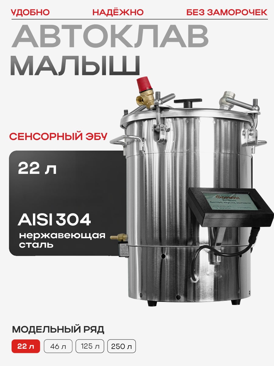 Объём 22 литра позволяет загружать до 18 банок по 0,5 л или 6 банок по 1 л за один цикл. Удобно работать как со стандартными стеклянными банками, так и с жестяными консервными банками и реторт-пакетами. Это даёт возможность делать универсальные заготовки: от мясных тушёнок до соков, овощных салатов и компотов.