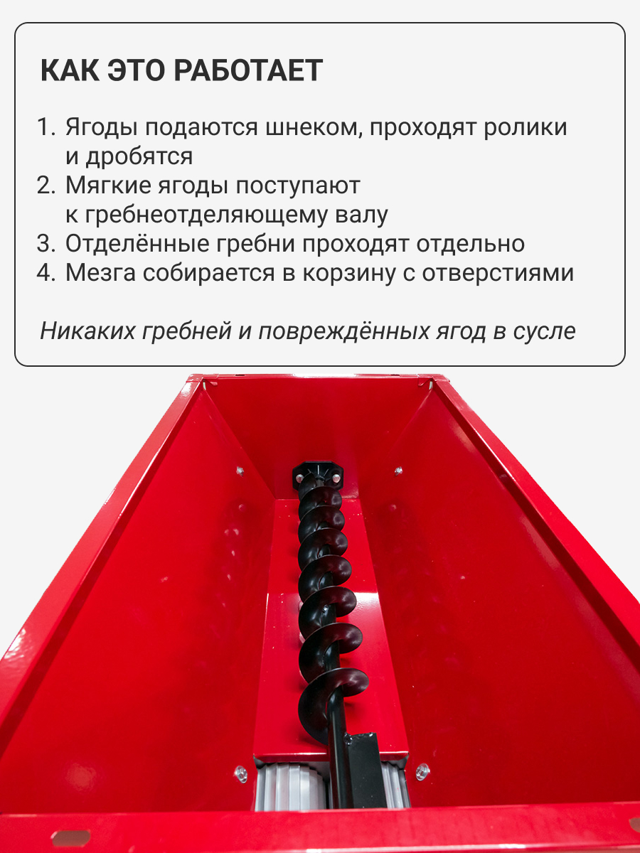 Виноград скользит по стенкам бункера (5) на пару роликов (8), где производится его дробление. После того, как он раздроблен, подается к гребнеотделительному валу (1), где отделяются стебли. Далее виноград поступает в корзину с отверстиями (2) и попадает в предварительно подставленную под машину емкость.