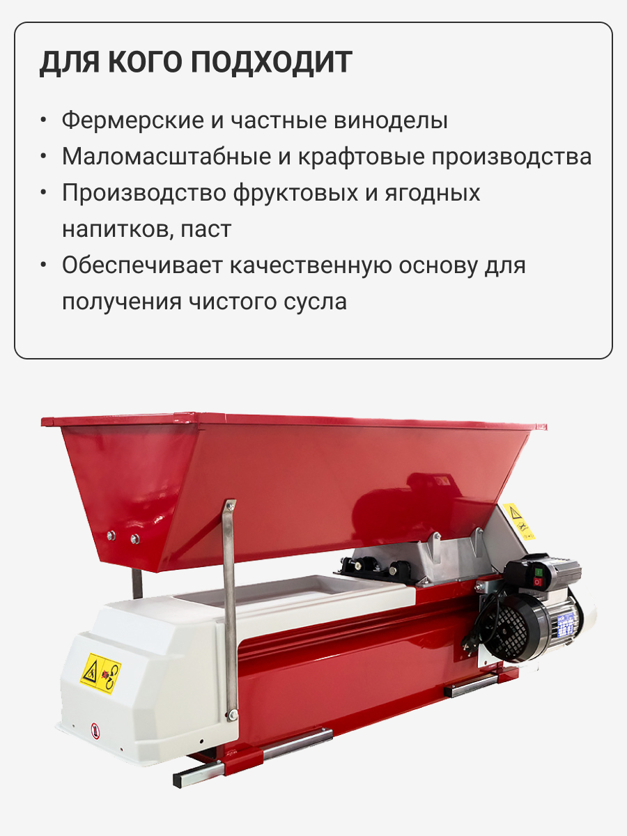 • Регулировка по мягкости дробления, что позволяет учитывать нюансы. получения мезги из винограда разных сортов и размеров.